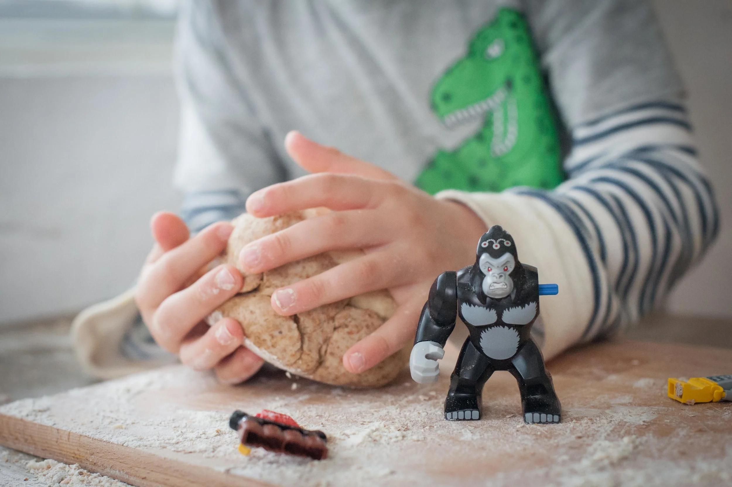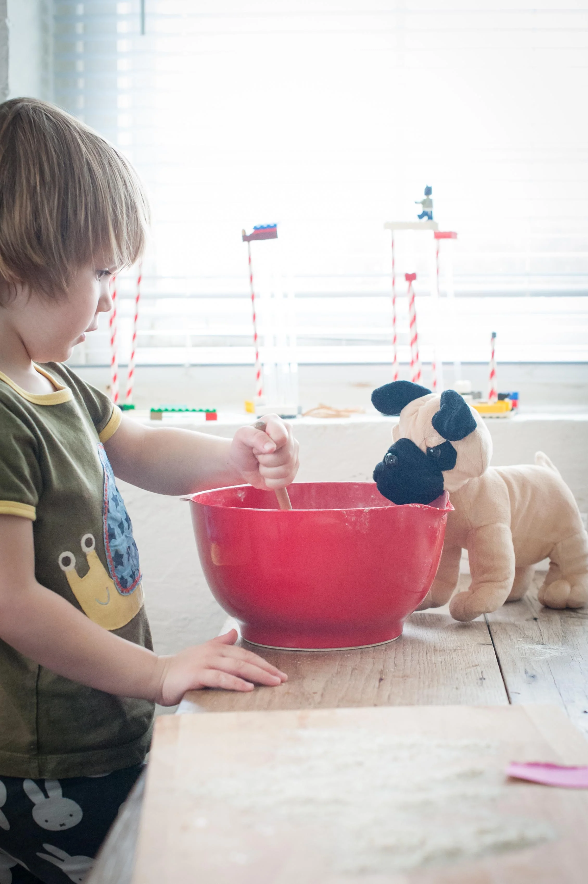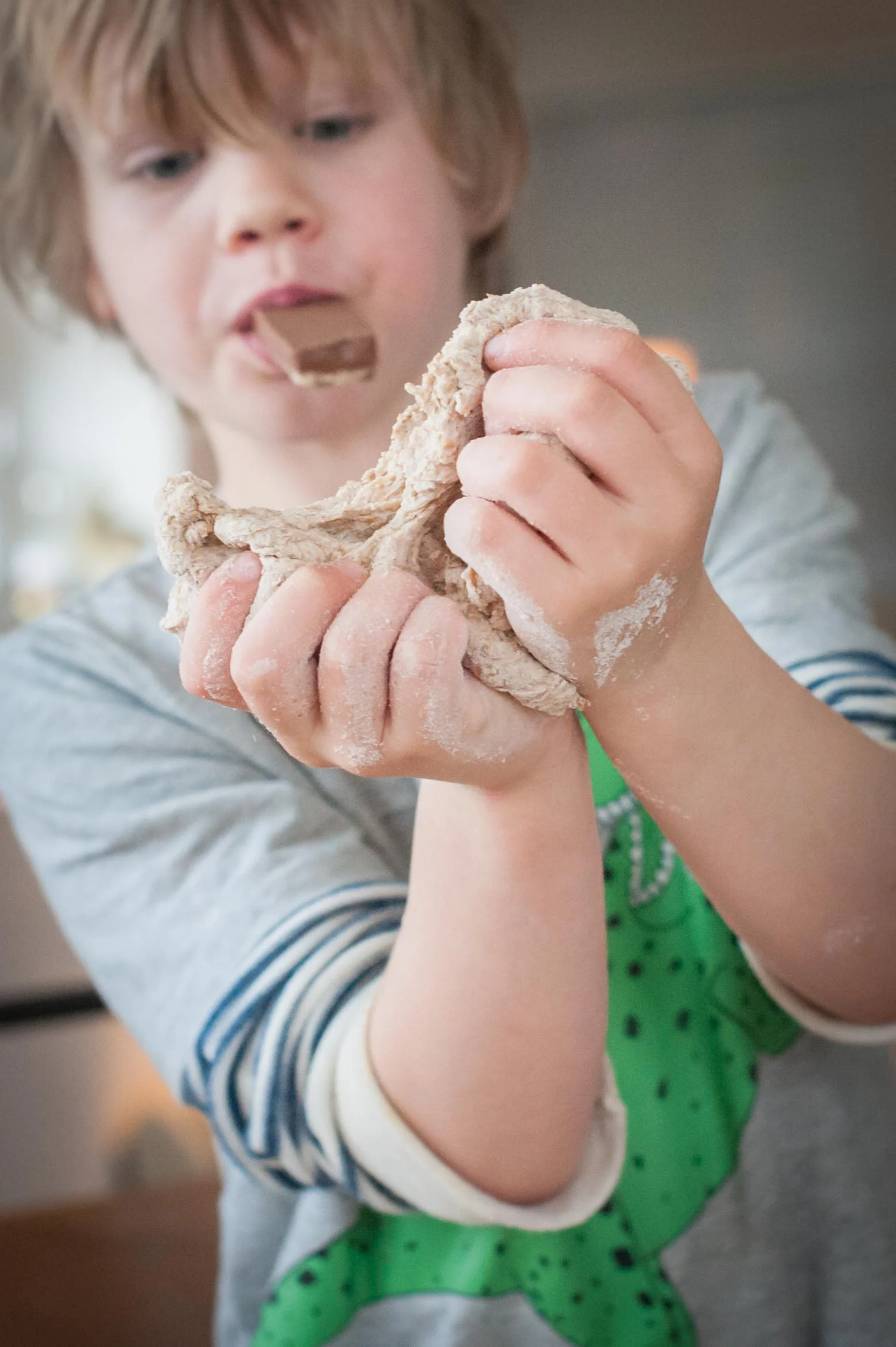 Jenson was slowly coming out of his mood by this point. Perhaps it was curiosity that drew him over to us but he was keen to get involved whatever the reason. He enthusiastically helped to sieve the flour, add the yeast and pour in the water. He absolutely loved feeling the gooey consistency of the bread mix between his fingers, and yes, a chocolate snack is compulsory while you bake!