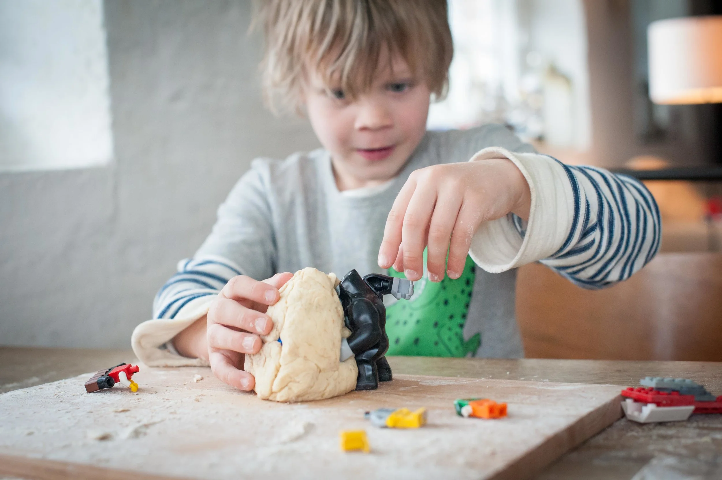 Technically we should have mixed cornflower with water but we mixed bicarbonate of soda with it instead! Turns out they both do near enough the same job: the concoction acts like a liquid but behaves like a solid when you hit it. Here Wren is on our second attempt using cornflower. Jenson was still engrossed in his monster eating LEGO story.
