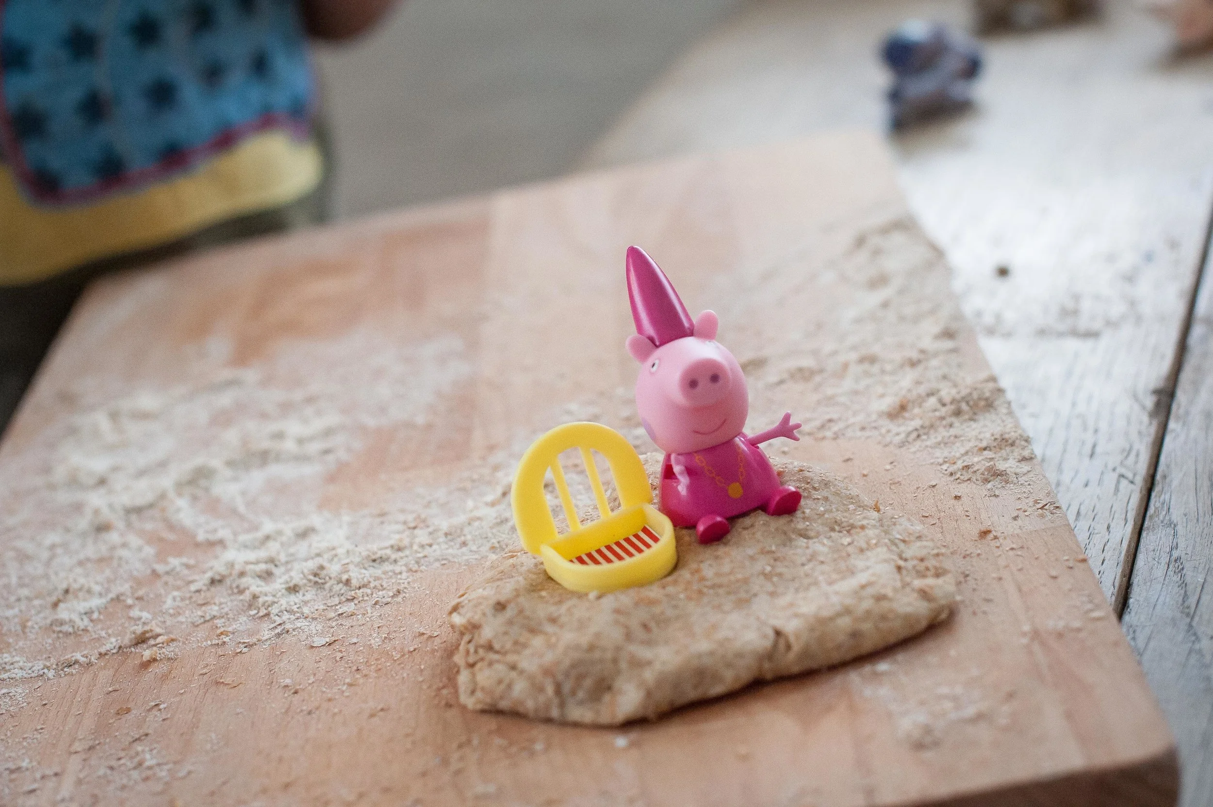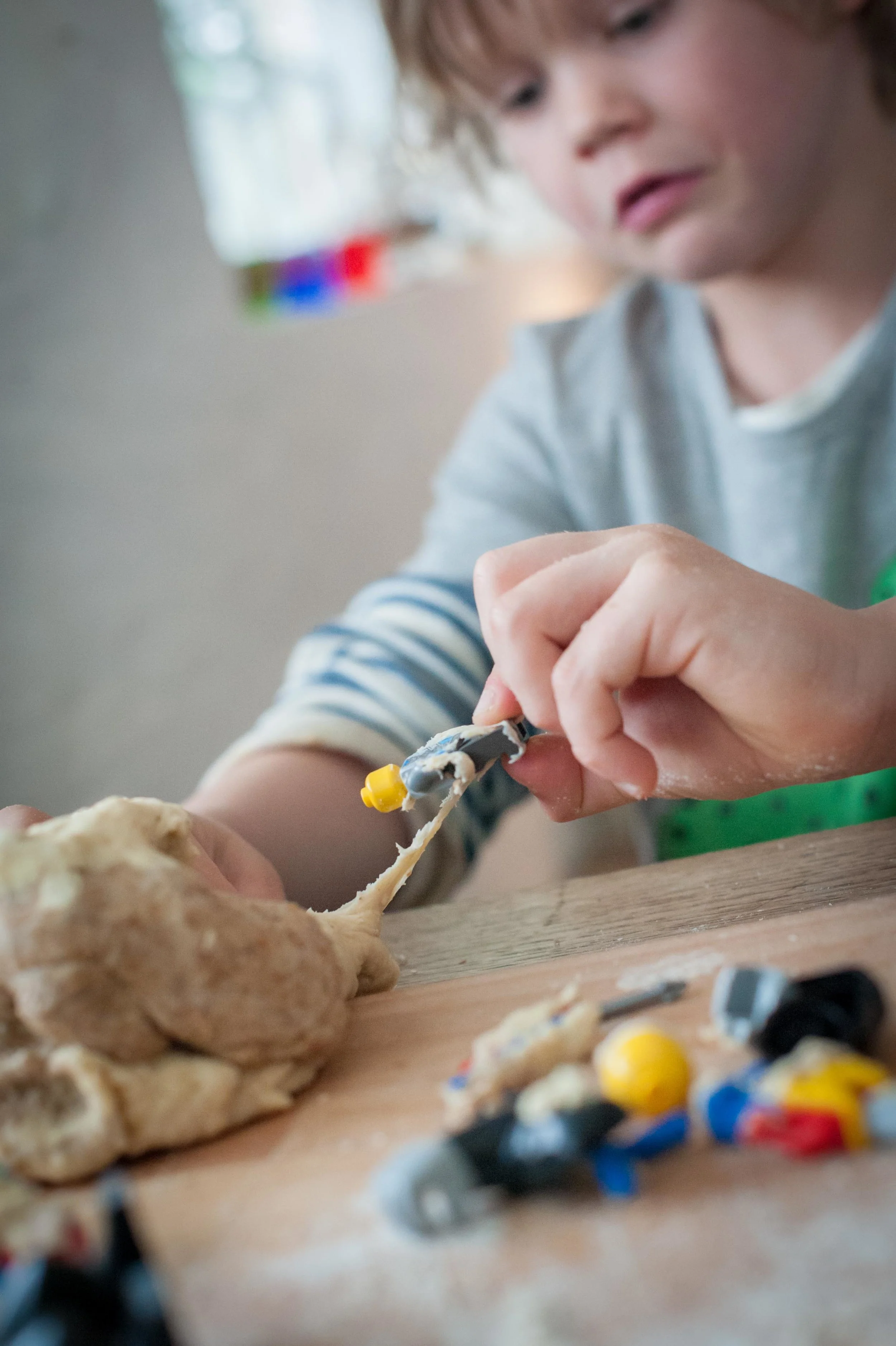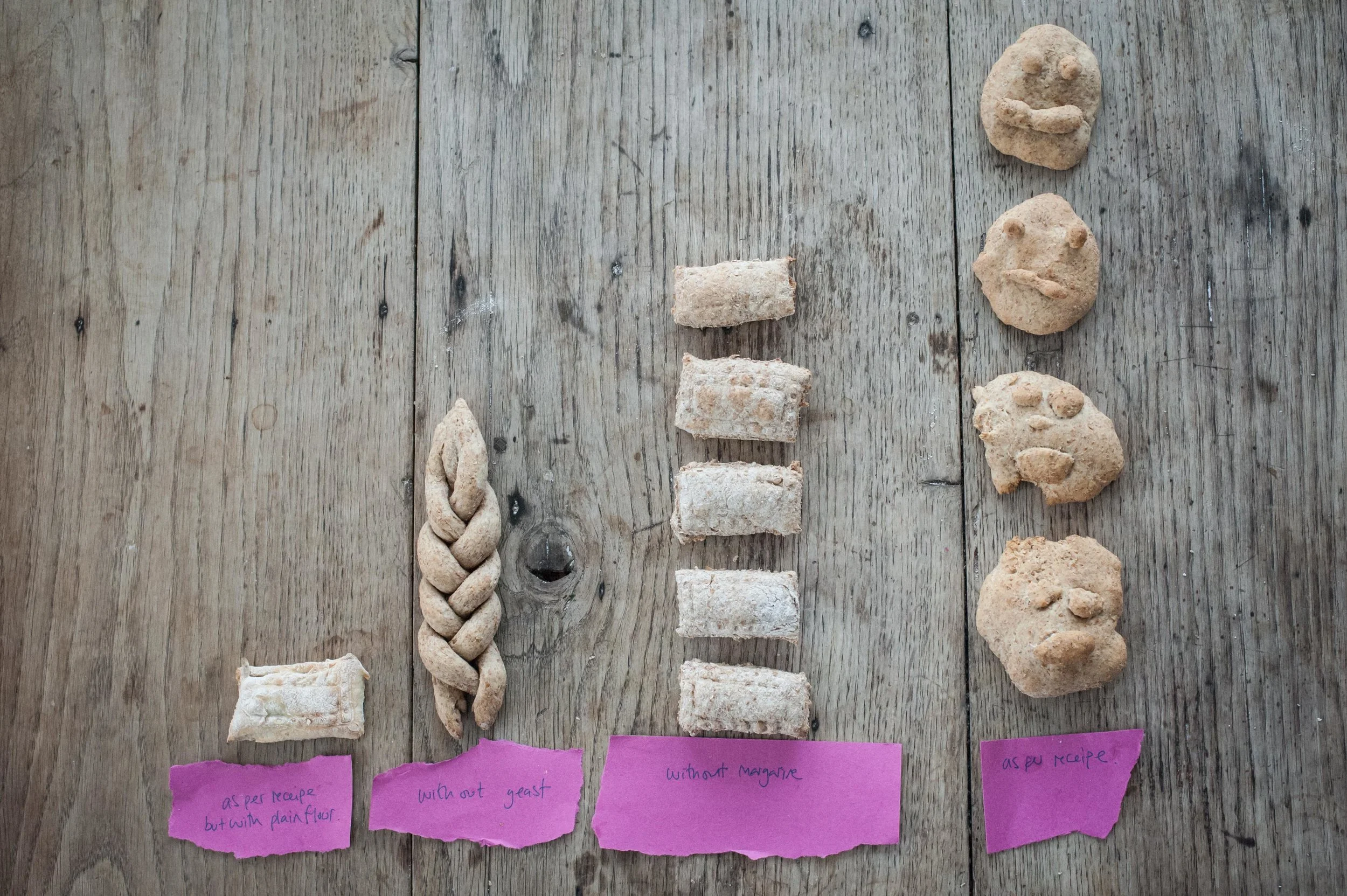 Once we had kneaded the mixture for ten minutes, Wren helped me to cut some shapes out. We popped them into the oven for fifteen minutes and made a start on our next combo: without margarine using strong wholemeal bread flour.