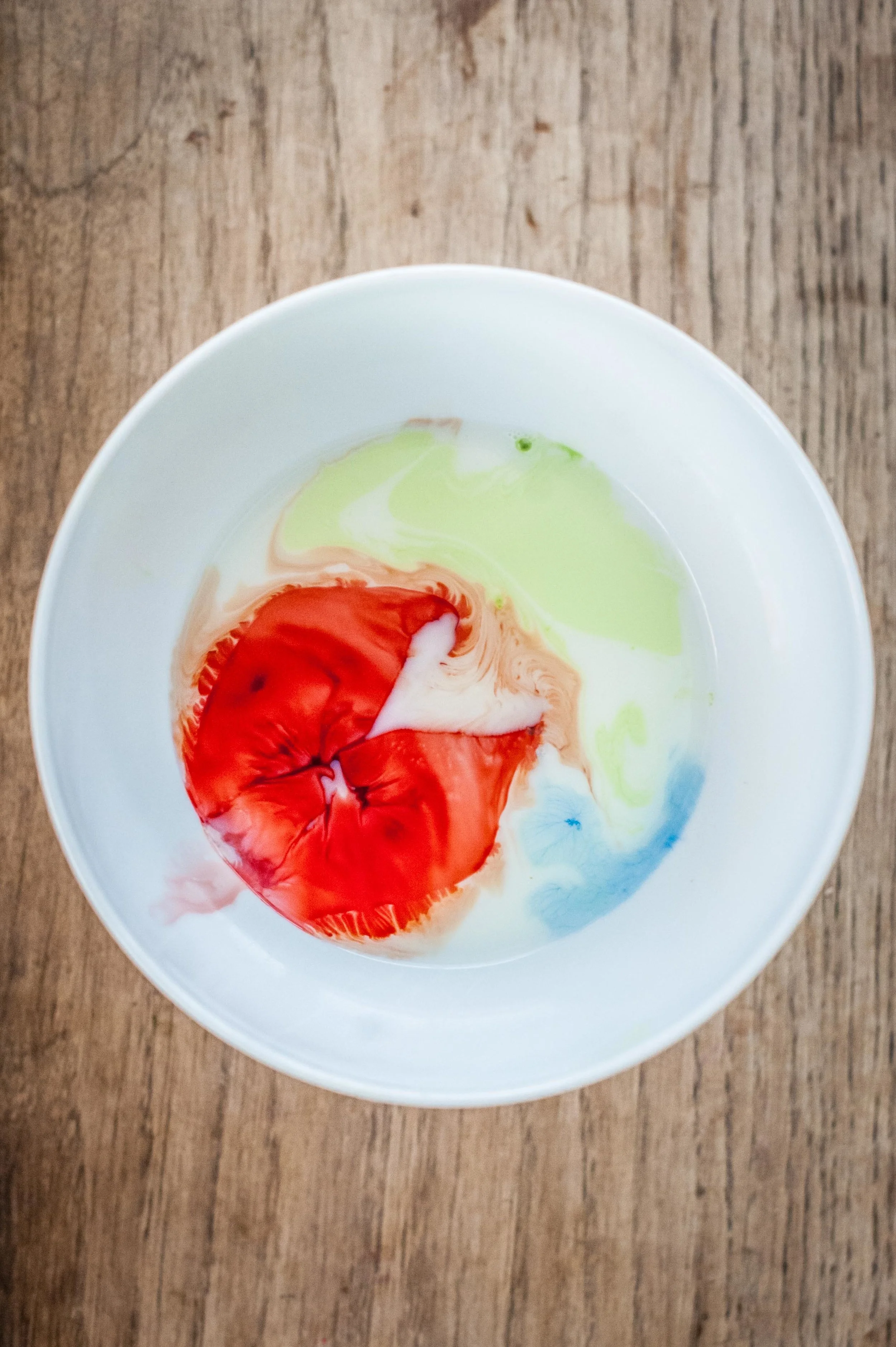 Some very unusual interactions take place when you mix a little milk, food colouring and a drop of washing up liquid. Typing this up now I can see we forgot to add the washing up liquid to our concoction!! I got so caught up in the moment with three pints of milk, two children and multiple bottles of food colouring that I must have overlooked the toolkit and instructions. Never mind, we still created a nice effect and the children enjoyed experimenting with the three different types of milk: whole, skimmed and semi-skimmed.