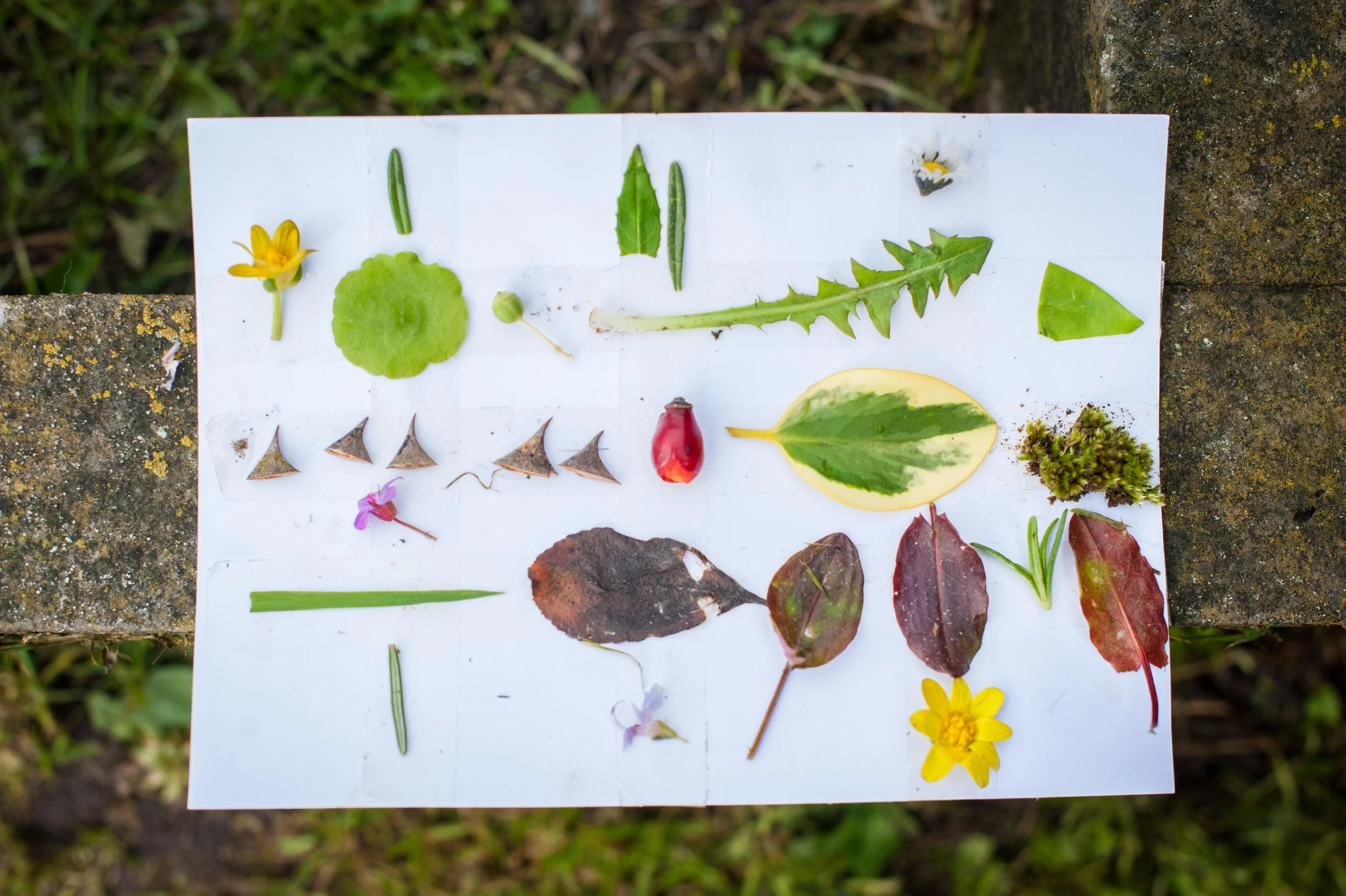Wren was the keener of the two; picking small blades of grass and flowers. Sadly, because everything was so wet with dew and sea mist, nothing really wanted to stick to the double sided sticky tape. This frustrated Jenson a lot. Eventually though, he came around to the idea and he ended up wanting to make two palettes while Wren became distracted by other interests.