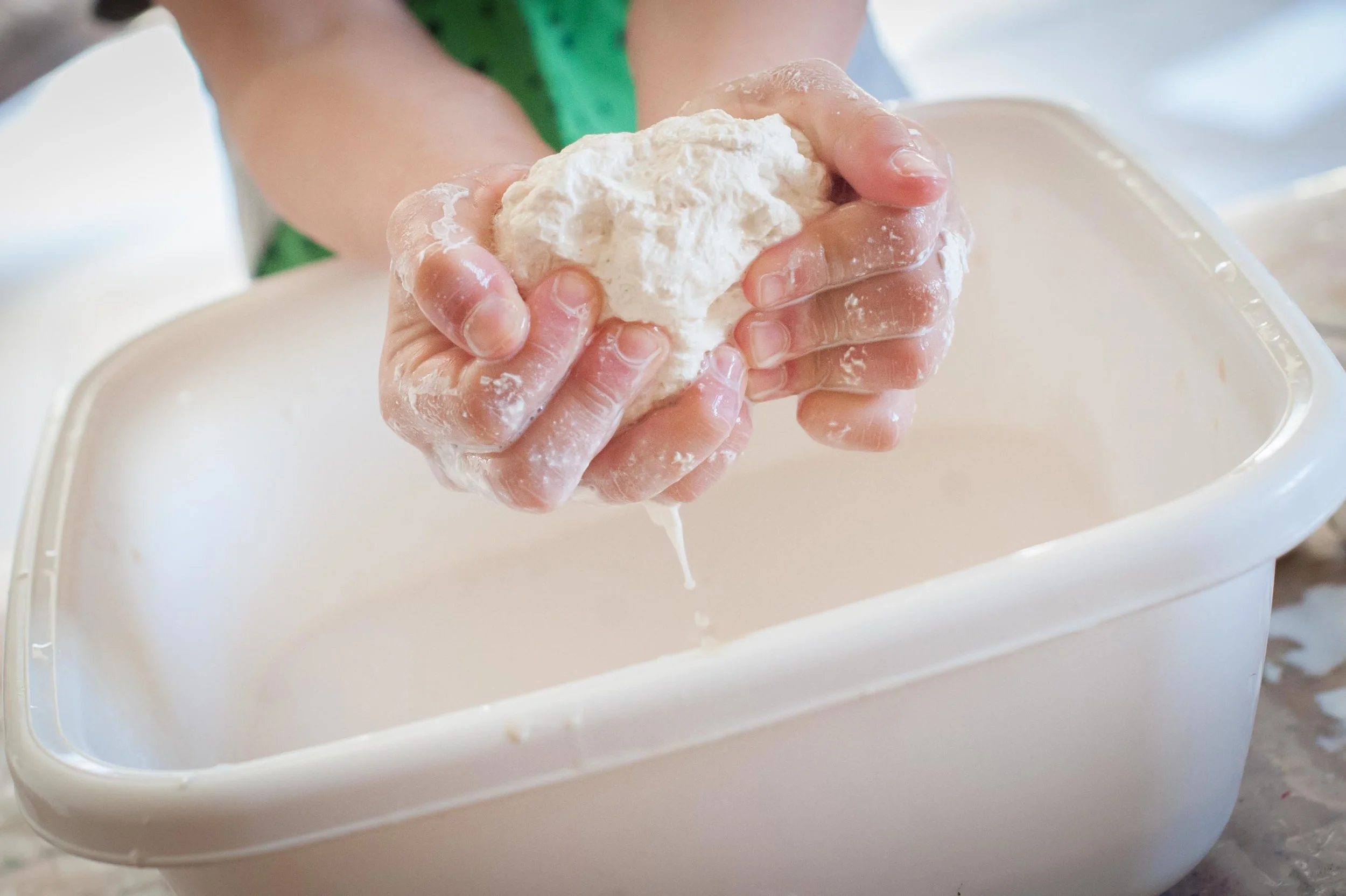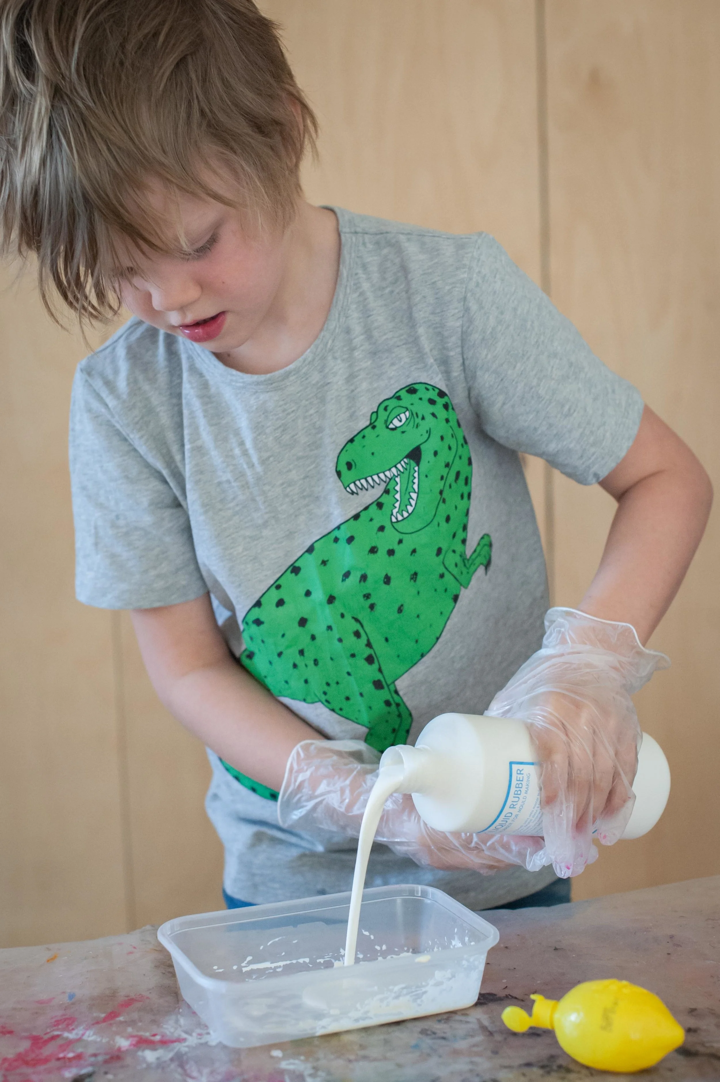 Next Jenson placed the solid rubber in a large bowl of water and moulded it into a ball shape using his hands. I helped him to dry it with a cloth afterwards.