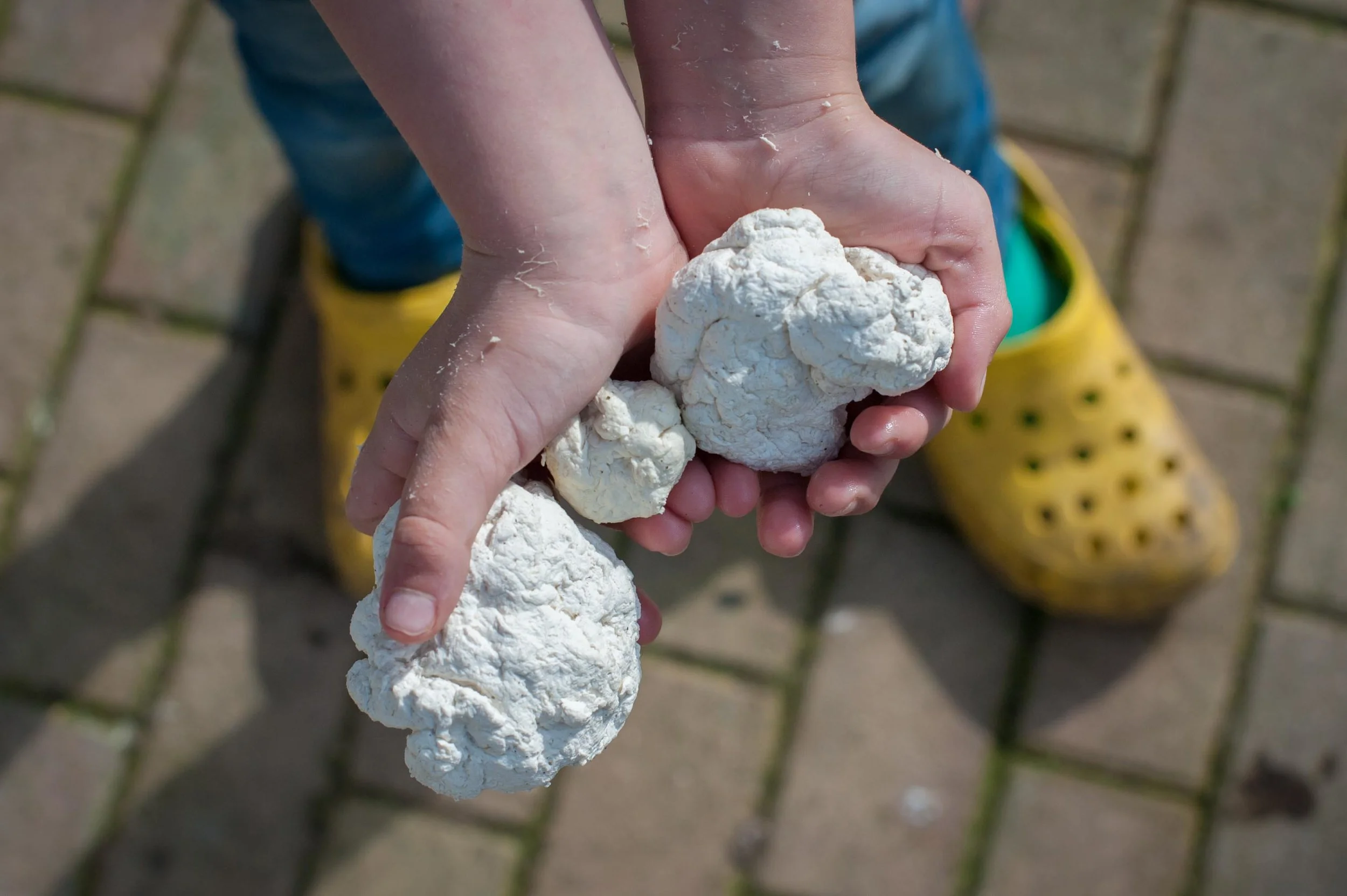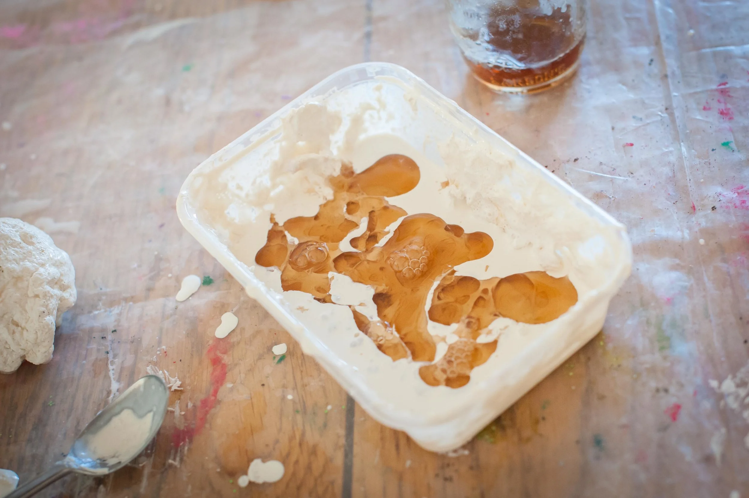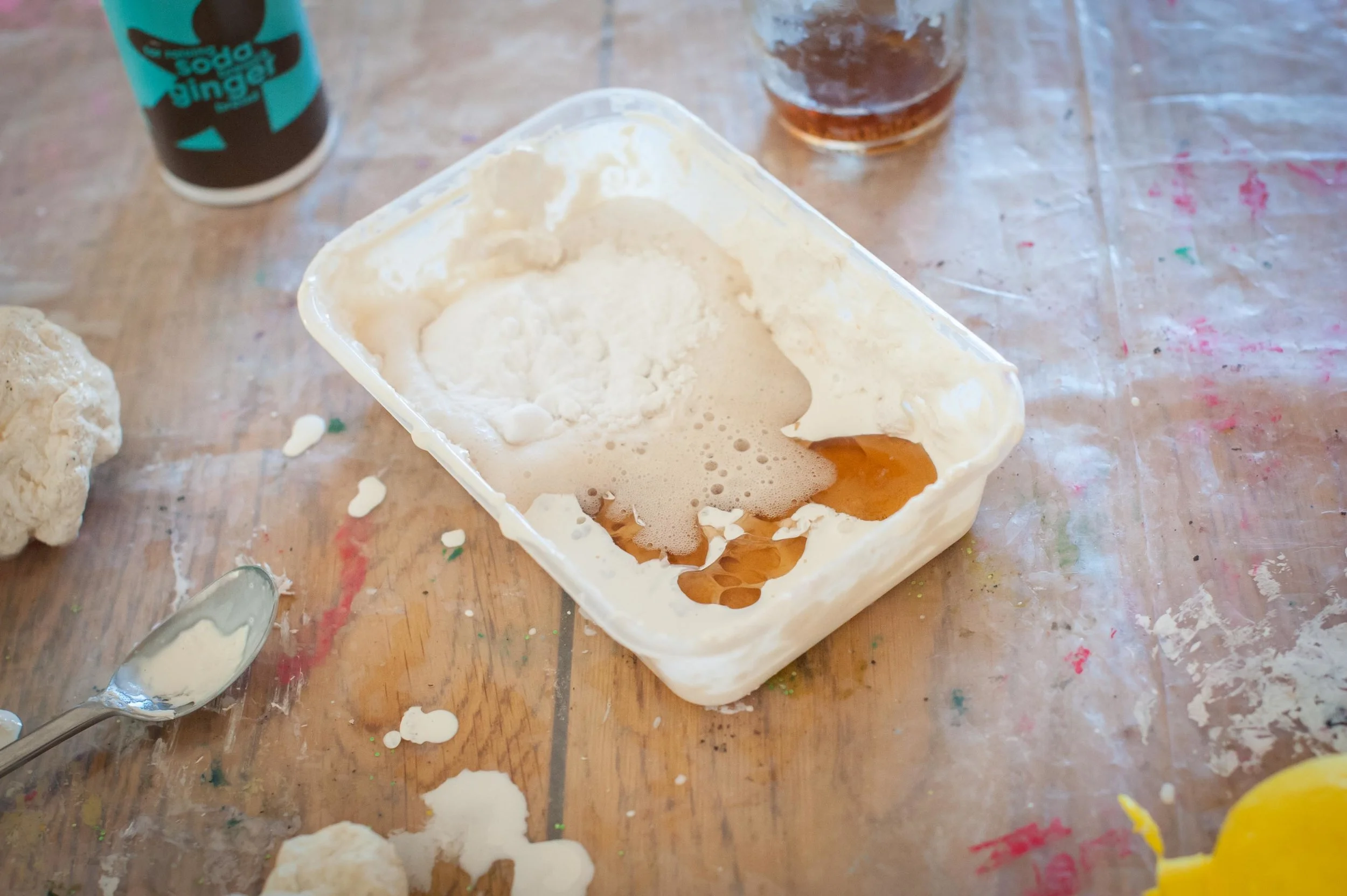 Next we added a small amount of lemon juice or vinegar and stirred it with a teaspoon until a solid rubber was formed. There was also the option to make a foam rubber ball, where bicarbonate of soda could be added prior to adding the acidic element. This is what Jenson is doing here.