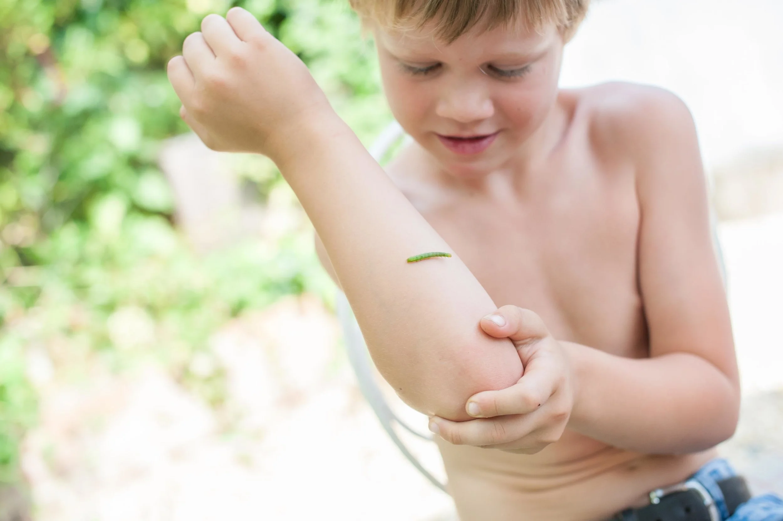 I would describe Jenson's encounter with the caterpillars as joyful. They crawled all over his body, tickling his tummy and his arms. They are curious little creatures who are surprisingly quick when they want to be! Wren was equally as fascinated.