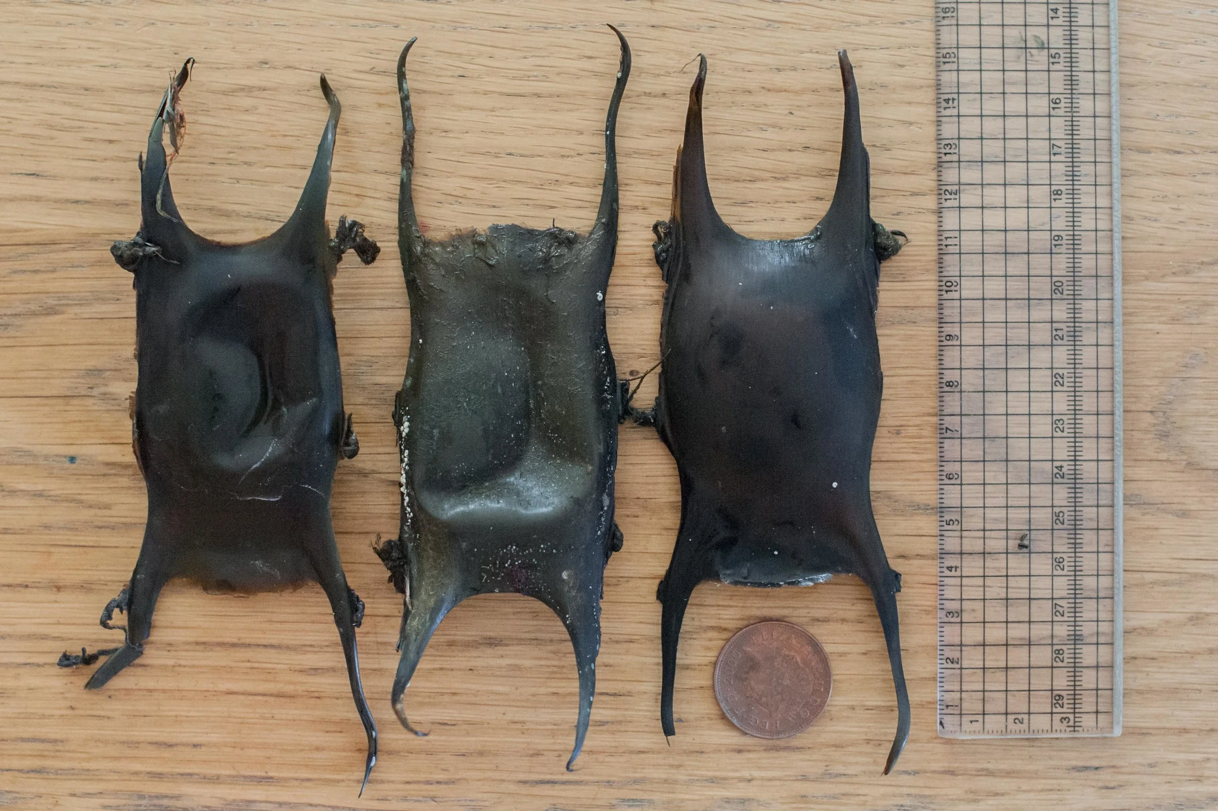 There are over ten species of skate and ray, and only a few species of shark in UK waters that reproduce by laying eggcases on the seabed. Each species’ eggcase is different in shape and size. Eggcases remain safely on the seabed until the juvenile has hatched, and then the empty eggcases often get washed up on beaches and can be found amongst the seaweed in the strandline.