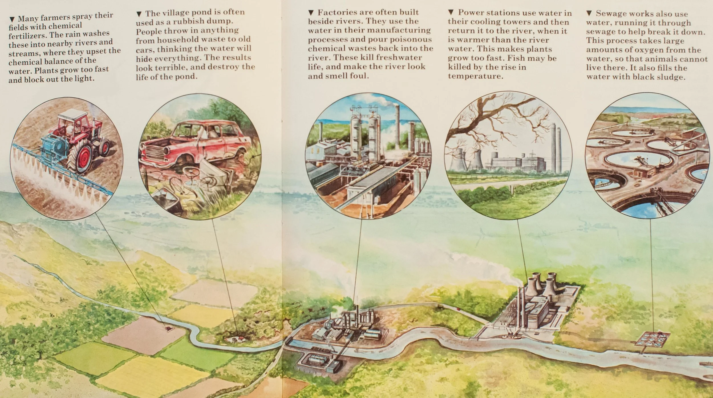 Watching him build this wonderful cityscape inspired me to pull out one of our recent book purchases from the Red Cross Book Shop on the Bath Road. What he was creating reminded me of a page I had seen in it. The page was about pollution and how mankind is responsible for 99% of the world's problems.