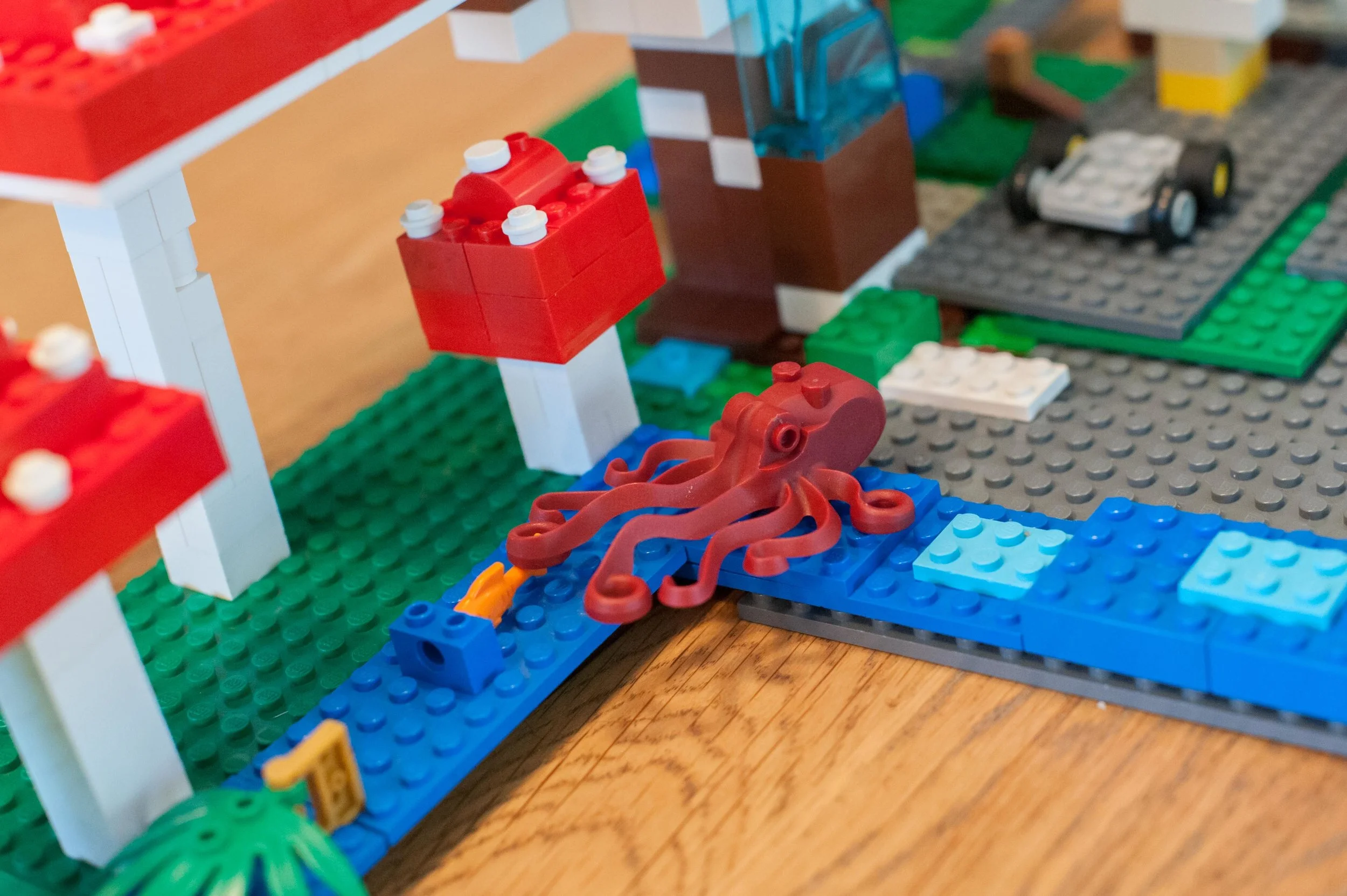 And so this is what Jenson brought to his LEGO cityscape. Below is a photograph of an octopus and a fish, (a grouper) that Jenson constructed entirely on his own. I love how he takes what he learns and applies it to something else. LEGO is his way of making sense of the world around him. He'll see something on the TV, remember it, then bring it into his world and give it real meaning. He thinks, creates and understands. It's a great process.